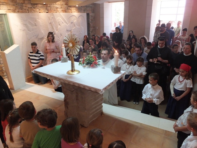 U subotu prijepodne, u svetištu, započelo je euharistijsko klanjanje kao svakog devetog u mjesecu. Presveto je izložio don Nikola Berišić, župnik iz Blata. Klanjanju su prisustvovala djeca iz svih vrtića, njihovi roditelji, odgajateljice, sestre Kćeri Milosrđa i nekoliko vjernih štovateljia bl. Marije Propetoga. Nakon kratke molitve u svetištu, u samostanskoj dvorani organizirana je tribina za roditelje djece. Predavanje je održao don Ivan Bodrožić, svećenik Splitsko Makarske nadbiskupije, a tema predavanja bila je: „Kupiti ili otkupiti dijete“, čiji kratki sadržaj možete pročitati naniže.