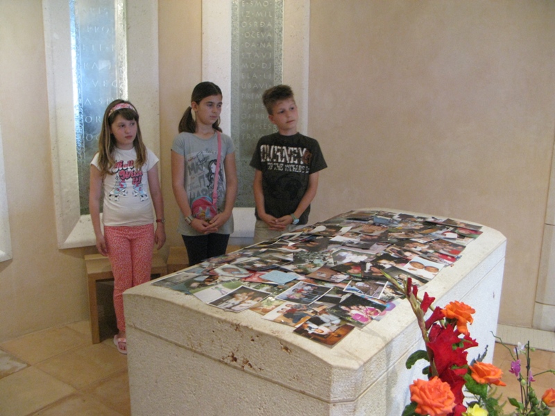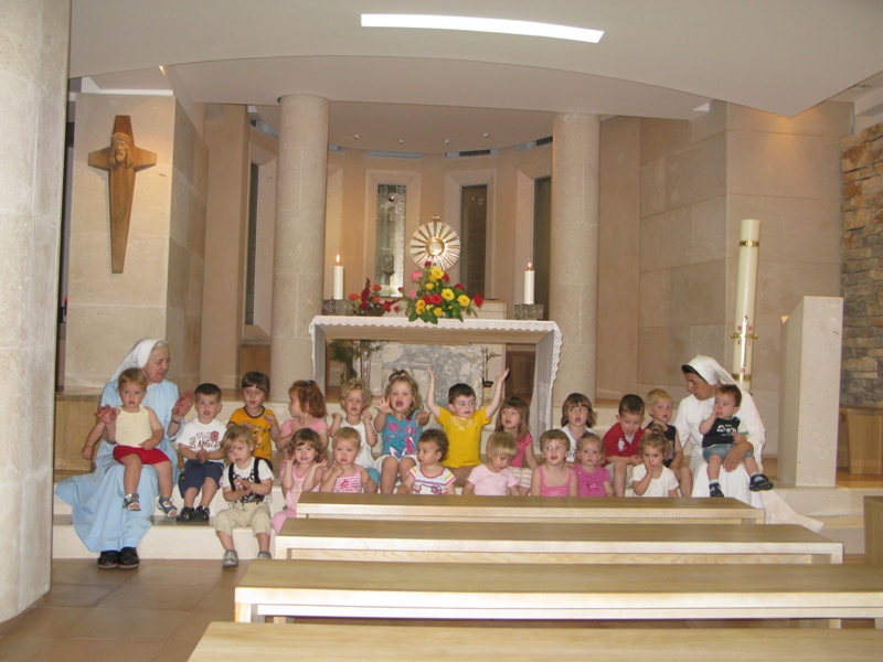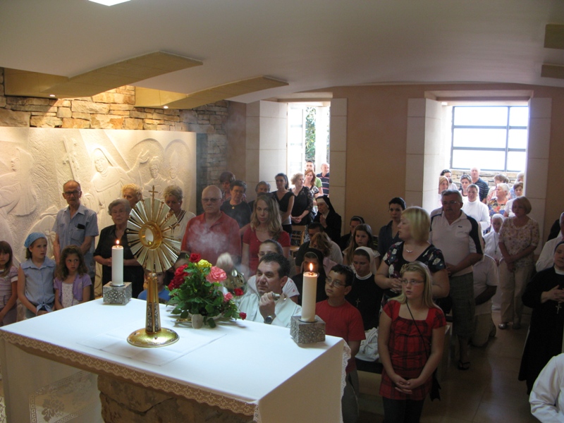 Euharistijsko klanjanje započelo je u 9.00 sati u prisutnosti časnih sestara, te otvorenih dječjih srca naših vrtićkih mališana. Presveto je izložio župnik don Nikola Berišić. Svetu misu predvodio je don Goran Vilov uz koncelebraciju don Marinka Šljivića i don Nikole Berišića. Don Goran, svećenik je Subotičke biskupije s kojim je na hodočašće u Blato došlo nekoliko desetaka vjernika iz tih krajeva, te su svojom prisutnošću uzveličeli euharistijsko slavlje. Za vrijeme misnoga slavlja primjetili smo da je don Goran izuzetno radostan zbog dolaska u svetište te svoje oduševljenje nije mogao sakriti. Podijelio je s nama svoju radost istaknuvši nekoliko puta kako je lijepo vidjeti časne sestre koje slijede Isusa po primjeru bl. Marije Propetoga. Ona je bila izuzetno kreposna osoba, ali svoj redovnički poziv sigurno ne bi mogla ostvariti bez duboke duhovnosti koju je u sebi nosila. Stoga nam je ostavila primjer i pouku koju je više puta isticala kako odjelo ne čini redovnicu.