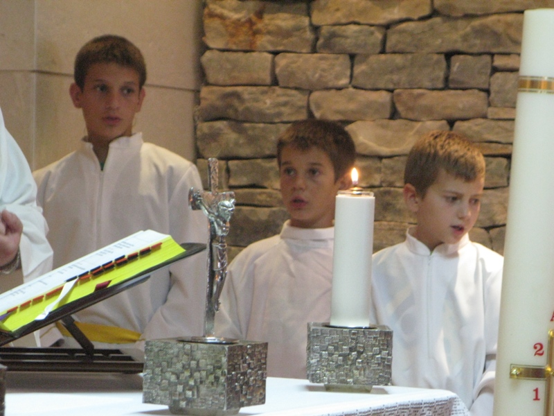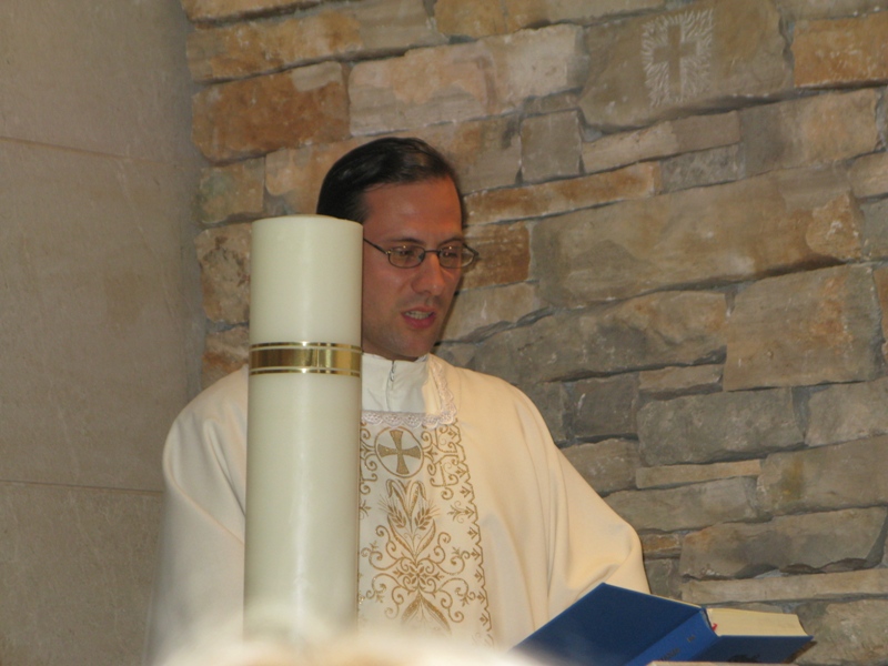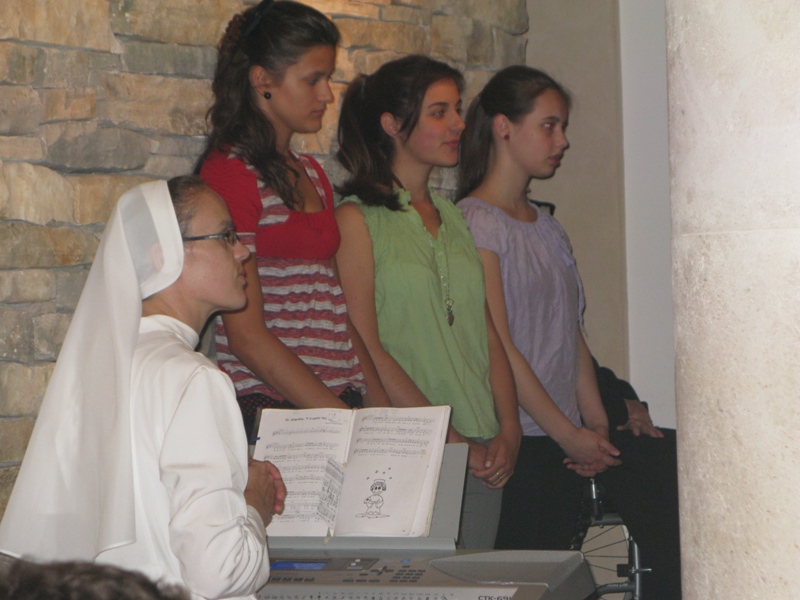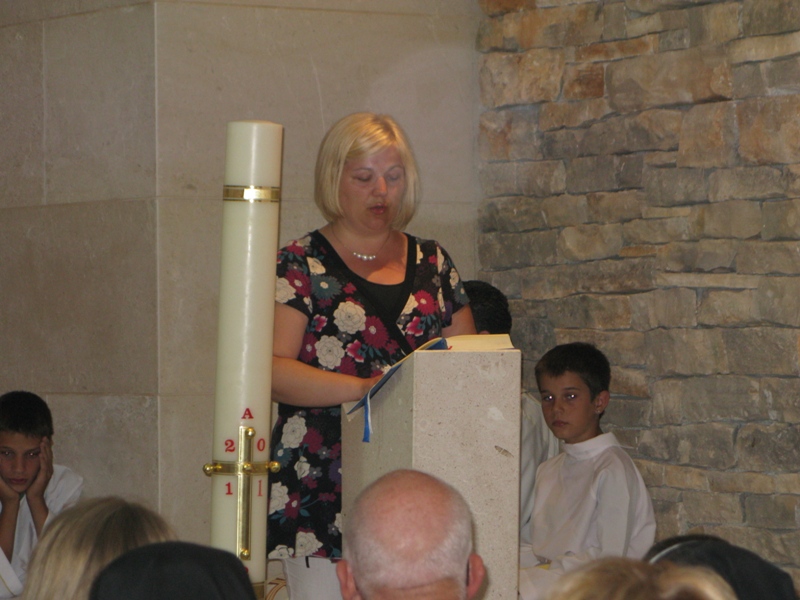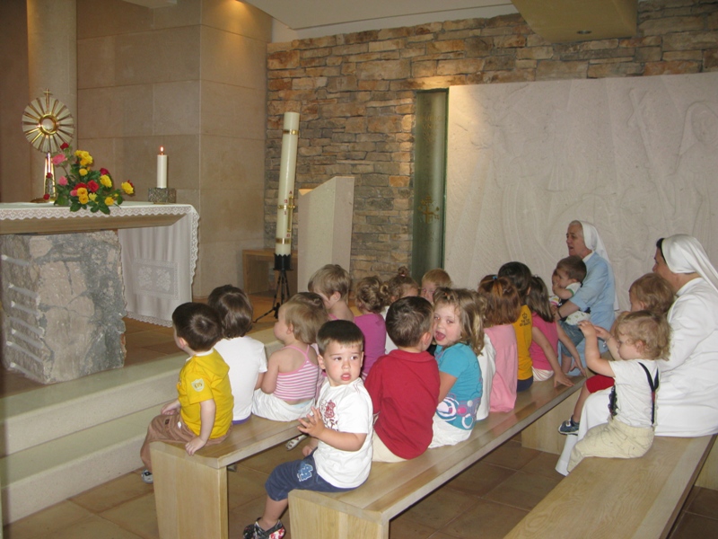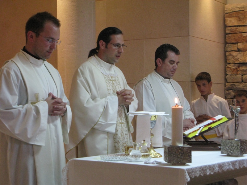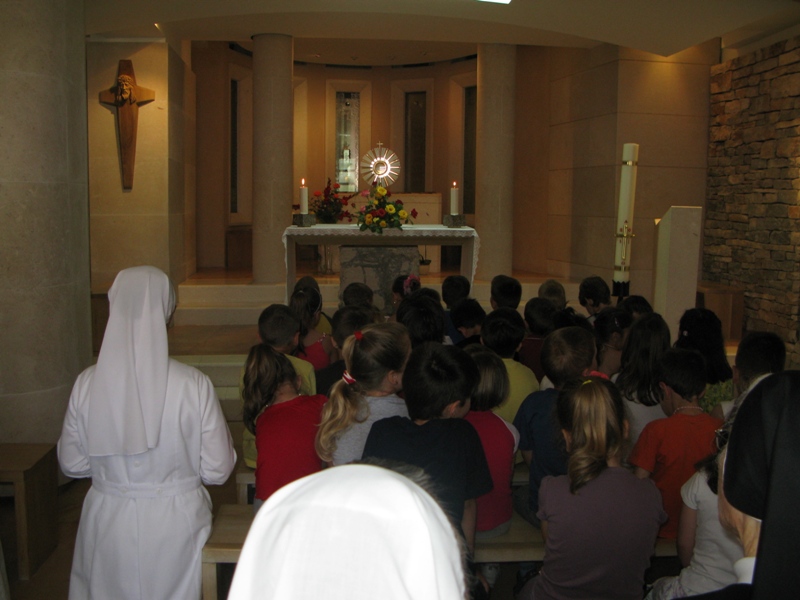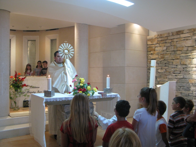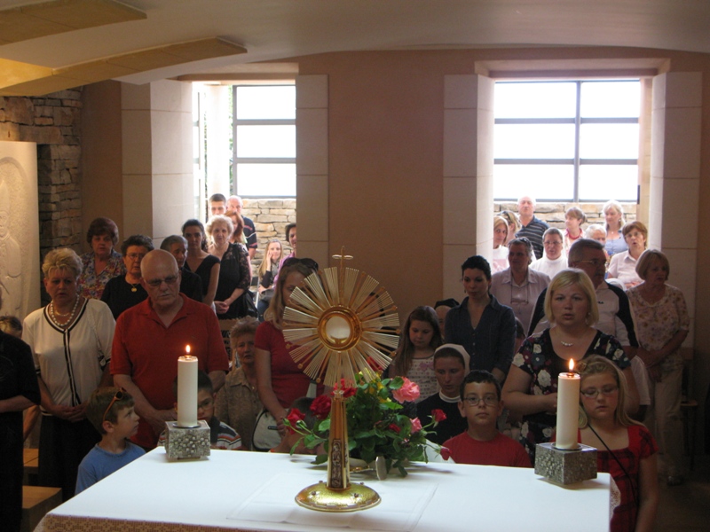 Euharistijsko klanjanje započelo je u 9.00 sati u prisutnosti časnih sestara, te otvorenih dječjih srca naših vrtićkih mališana. Presveto je izložio župnik don Nikola Berišić. Svetu misu predvodio je don Goran Vilov uz koncelebraciju don Marinka Šljivića i don Nikole Berišića. Don Goran, svećenik je Subotičke biskupije s kojim je na hodočašće u Blato došlo nekoliko desetaka vjernika iz tih krajeva, te su svojom prisutnošću uzveličeli euharistijsko slavlje. Za vrijeme misnoga slavlja primjetili smo da je don Goran izuzetno radostan zbog dolaska u svetište te svoje oduševljenje nije mogao sakriti. Podijelio je s nama svoju radost istaknuvši nekoliko puta kako je lijepo vidjeti časne sestre koje slijede Isusa po primjeru bl. Marije Propetoga. Ona je bila izuzetno kreposna osoba, ali svoj redovnički poziv sigurno ne bi mogla ostvariti bez duboke duhovnosti koju je u sebi nosila. Stoga nam je ostavila primjer i pouku koju je više puta isticala kako odjelo ne čini redovnicu.